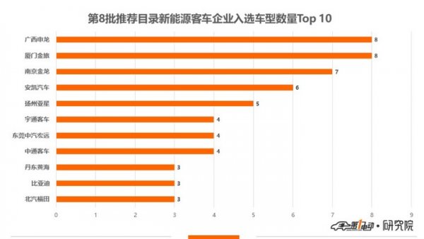 總體來(lái)看,Top10企業(yè)入選車型數(shù)量達(dá)3款或以上,其余23家客車生產(chǎn)企業(yè)入選車型為2款或1款。