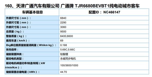 本批次入選的3款快充類純電動(dòng)客車均為廣通牌客車,分別來(lái)自成都廣通(型號(hào)為CAT6123CRBEVT純電動(dòng)城市客車)、天津廣通(型號(hào)為TJR6680BEVBT1純電動(dòng)城市客車)和蘭州廣通(型號(hào)為L(zhǎng)ZG6105BEVBT1純電動(dòng)城市客車)。
