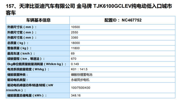 本批入選的82款非快充類純電動(dòng)客車車型來(lái)看,均可以達(dá)到這一標(biāo)準(zhǔn)。其中天津比亞迪一款型號(hào)為TJK6100GCLEV金馬牌純電動(dòng)低入口城市客車等速法續(xù)航里程最高,達(dá)670公里。