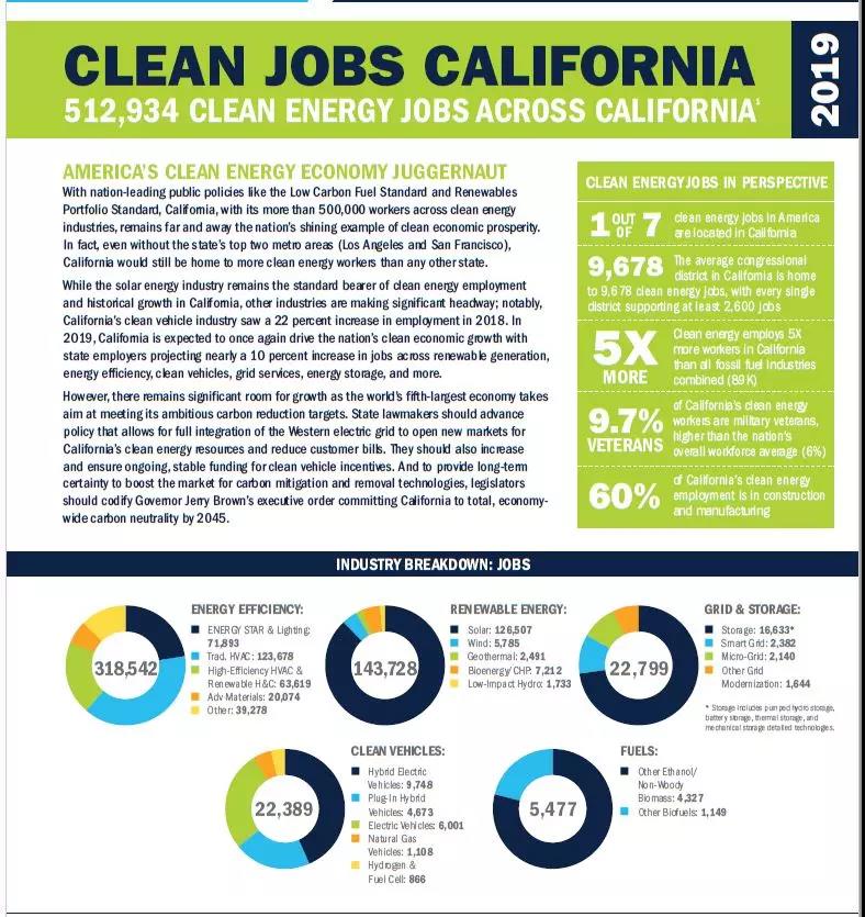 ——在全州范圍內(nèi),2018年清潔能源行業(yè)共有512,934個(gè)就業(yè)崗位。其中包括可再生能源就業(yè),如安裝太陽能和風(fēng)能;建設(shè)電動(dòng)和混合動(dòng)力汽車;在建筑物中進(jìn)行能源效率工作;制造清潔燃料和建設(shè)電池存儲(chǔ)項(xiàng)目。