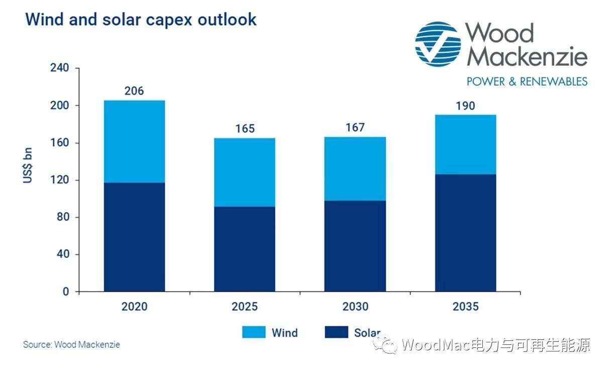 2025年后,資本市場(chǎng)將反彈。我們預(yù)計(jì),到2035年,由于項(xiàng)目經(jīng)濟(jì)性的提高、利好政策的出臺(tái),可再生能源市場(chǎng)將更具吸引力,資本支出將重新回到1,900億美元的水平。