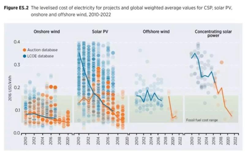從上個世紀80年代、90年代到2000年代和2010年代的政策補貼最終使太陽能和風電成本降低了十倍之多。到2015年左右,即使沒有補貼,新建的太陽能或風能電廠成本有時比建造新的燃煤或天然氣發(fā)電便宜。
