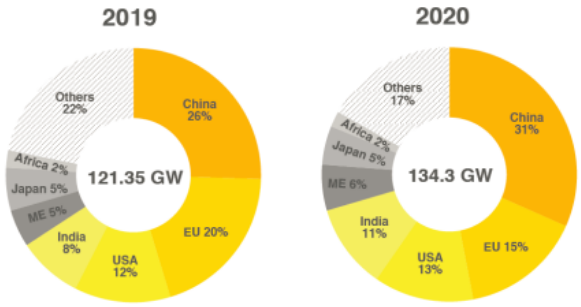 受本次疫情影響,供需均受到短期抑制,但2020年國外市場需求增長依然強勁,國內(nèi)市場也有望在延遲數(shù)月后重新恢復(fù),據(jù)PVInfoLink預(yù)測,全年有望實現(xiàn)42.5GW新增裝機,同比增長41.2%。