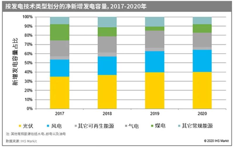 據(jù)埃信華邁(IHS Markit)預(yù)測(cè),2020年全球凈新增發(fā)電裝機(jī)將達(dá)到2.9億千瓦,較2019年增加5%。其中,并網(wǎng)光伏和風(fēng)電占比65%左右,而煤電和氣電合計(jì)僅占25%。