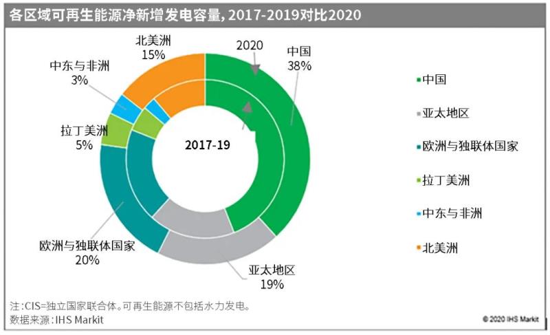 圖2:各地區(qū)可再生能源凈新增發(fā)電容量,2017-2019對(duì)比2020
