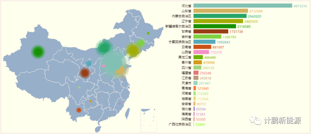 目前風電累計核發(fā)量23315779個,占據(jù)前三甲的是河北省、山東省、內(nèi)蒙古自治區(qū),核發(fā)量分別是4915310、2712399、2642620,占總核發(fā)量的44.05%。