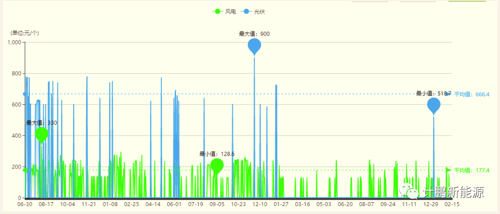 從2017年7月1日至今,風電綠證成交價格最大值330元,最小值128.6元,平均值177.4元;光伏綠證成交價格最大值900元,最小值518.7元,平均值666.4元。