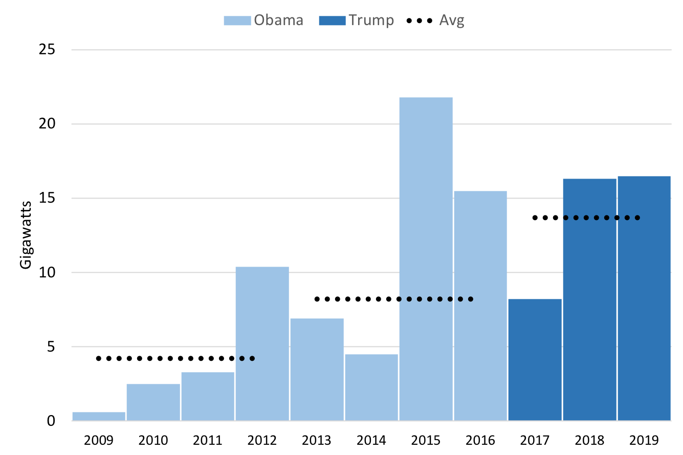自2011年以來,經(jīng)濟(jì)合作與發(fā)展組織(OECD)成員國(guó)的燃煤發(fā)電產(chǎn)能一直在下降。2019年,已退役的煤電產(chǎn)能中近一半位于美國(guó),年退役量達(dá)到歷史記錄排名第二。在歐盟,退役產(chǎn)能規(guī)模歷史排名第四。在特朗普任期(2017-2019年)中,美國(guó)退役的燃煤電廠與奧巴馬任期(2009-2016年)相比增加了67%。在奧巴馬任職期間,平均每年退役煤電8.2吉瓦,而在特朗普任職期間,平均每年退役13.7吉瓦(見下圖)。
