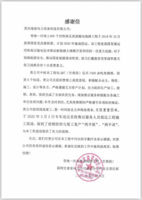 據(jù)悉,重慶順泰鐵塔制造有限公司瑜煌廠區(qū)近期收到國網(wǎng)甘肅省電力建設(shè)分公司業(yè)主項目部的感謝信,對重慶順泰按期、高效、保質(zhì)完成青?!幽?plusmn;800千伏特高壓直流輸電線路工程(甘肅段)供貨任務(wù),并在新冠肺炎疫情期間落實疫情防控與復(fù)工復(fù)產(chǎn)“兩手抓”、“兩不誤”,第一時間按照業(yè)主和現(xiàn)場需求,克服重重困難,派專車將首批售后服務(wù)人員送往施工現(xiàn)場,為該工程建設(shè)提供有力保障表示感謝。