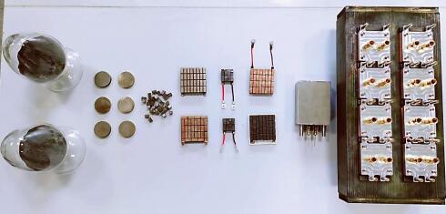 在制備車間的產(chǎn)品展臺上,擺放著不同形態(tài)的熱電材料、電極模塊以及熱電器件樣品。研發(fā)人員告訴記者,據(jù)行業(yè)調(diào)研和公開資料顯示,國內(nèi)外熱電轉(zhuǎn)換效率普遍在8%以下,新奧科研團(tuán)隊經(jīng)過不懈探索,已經(jīng)成功突破行業(yè)技術(shù)瓶頸,擁有了高性能材料組分的配方,掌握了相關(guān)材料及模塊的制備核心技術(shù),獨創(chuàng)了熱電模塊防擴散層和穩(wěn)固焊接工藝,從而具備了高性能熱電材料、模塊、器件全流程生產(chǎn)和檢測能力。