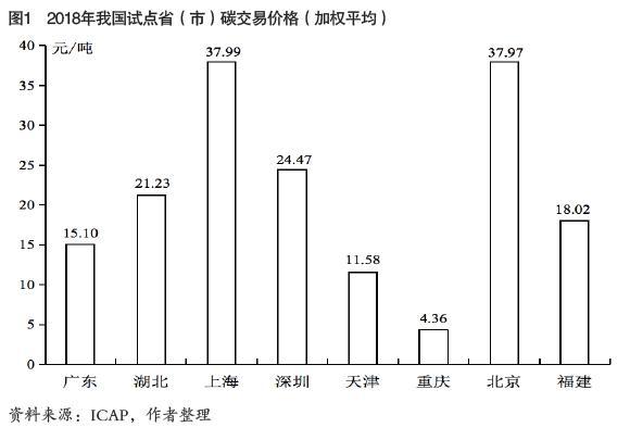 2011年10月,國家發(fā)展改革委確定在北京、天津、上海、重慶、廣東(廣州)、湖北、深圳開展碳排放權(quán)交易試點,2013年6月,深圳率先啟動碳交易;2016 年9月,福建省為貫徹落實《國家生態(tài)文明試驗區(qū)(福建)實施方案》,加入碳交易試點。目前,8 個試點地區(qū)覆蓋了電力、鋼鐵、水泥、建筑、交通運輸、石油化工等行業(yè)超過3200家重點排放企業(yè),整體履約良好,低碳意識不斷提高,實現(xiàn)了碳排放總量和強(qiáng)度“ 雙下降” 。2 0 1 8 年我國試點省市碳排放權(quán)交易平均價格為21.3元/噸;截至2018年底,我國碳市場累計成交量接近8億噸,累計成交額超過110億元(我國試點省市碳交易價格見圖1,試點碳市場運行情況見表1)。