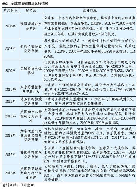 當(dāng)前,全球正面臨持續(xù)嚴(yán)峻的氣候問題挑戰(zhàn),各國2030年自主貢獻(xiàn)目標(biāo)與實現(xiàn)巴黎氣候協(xié)定目標(biāo)仍存在巨大缺口。為碳排放權(quán)定價、構(gòu)建碳交易市場,已成為國際社會促進(jìn)低碳發(fā)展和技術(shù)創(chuàng)新的關(guān)鍵政策工具。除目前已運行的碳市場外,還有許多國家或地區(qū)正在籌建或考慮建立碳交易系統(tǒng)(包含中國、俄羅斯、日本、墨西哥、巴西等國家系統(tǒng)以及美國各州等區(qū)域系統(tǒng))。隨著越來越多的國家或地區(qū)考慮將碳市場作為節(jié)能減排的政策工具, 碳交易已逐漸成為全球應(yīng)對氣候變化政策的核心支柱(全球目前主要碳市場運行情況見表2)。