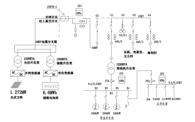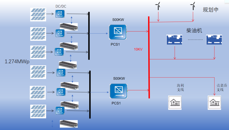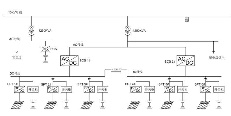光伏系統(tǒng)(1.274MWp)與儲能系統(tǒng)(7.239MWh)總直流母線連接,并由2臺BCS逆變器升至400Vac交流母線,并經(jīng)0.4/10.5kV升壓變升壓至10kV輸電線路接入用戶側(cè)。