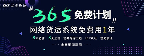 7月2日,G7重磅推出“網(wǎng)絡(luò)貨運365免費計劃”,為100家貨主企業(yè)提供網(wǎng)絡(luò)貨運系統(tǒng)一年(365天)的免費使用權(quán),助力其獲取網(wǎng)絡(luò)貨運資質(zhì)。