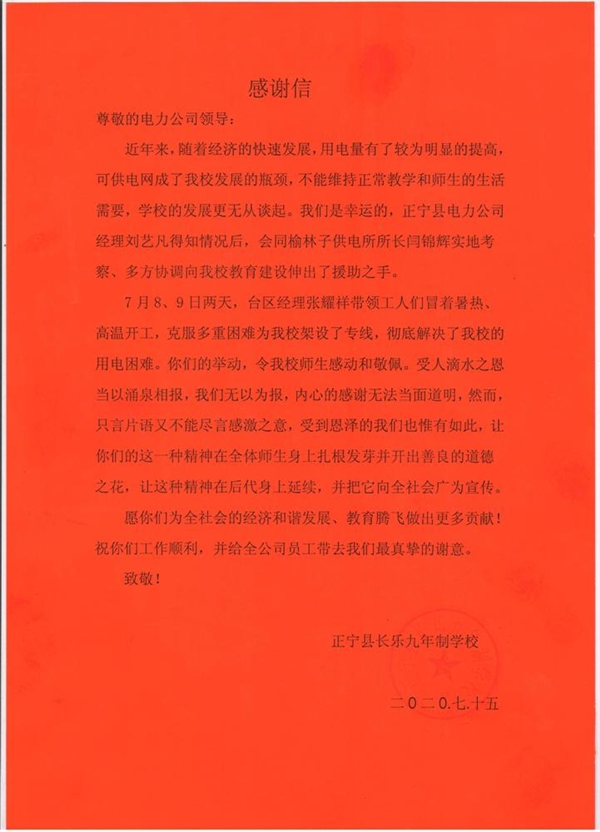 本網(wǎng)訊 “你公司臺區(qū)經(jīng)理張耀祥帶領(lǐng)工人們冒著暑熱、高溫開工,克服多重困難為我校架設(shè)專線,徹底解決了我校的用電困難。你們的舉動,令我校師生感動和敬佩……”7月13日,甘肅慶陽供電公司榆林子供電所來了兩位教師模樣的人,其中一個鄭重地從文件夾取出一張大紅紙小心翼翼地貼在了服務(wù)大廳門口,頓時引來前來辦理業(yè)務(wù)的客戶和供電所值班人員圍觀,只見大紅紙上第一行赫然書寫著“感謝信”三個大字。