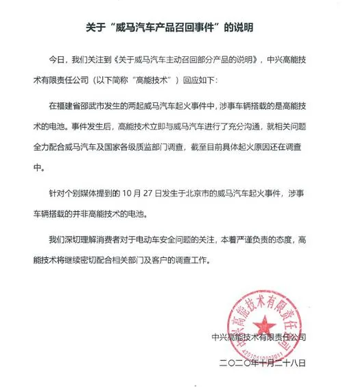 10月28日早上,威馬官微回應(yīng)稱未造成人員受傷及其他財(cái)產(chǎn)損失,正全力配合開展事故調(diào)查。10月28日午間,國家市場監(jiān)督管理總局發(fā)布了威馬汽車溫州公司召回部分動(dòng)力電池異常的電動(dòng)汽車的公告,該公告稱,2020年6月8日至2020年9月23日生產(chǎn)的共計(jì)1282輛2020款威爾馬斯特電動(dòng)汽車,裝備了型號(hào)為ZNP3914895A-75A的動(dòng)力電池,該款動(dòng)力電池生產(chǎn)商為中興高能技術(shù)有限責(zé)任公司(以下簡稱“中興高能”)。