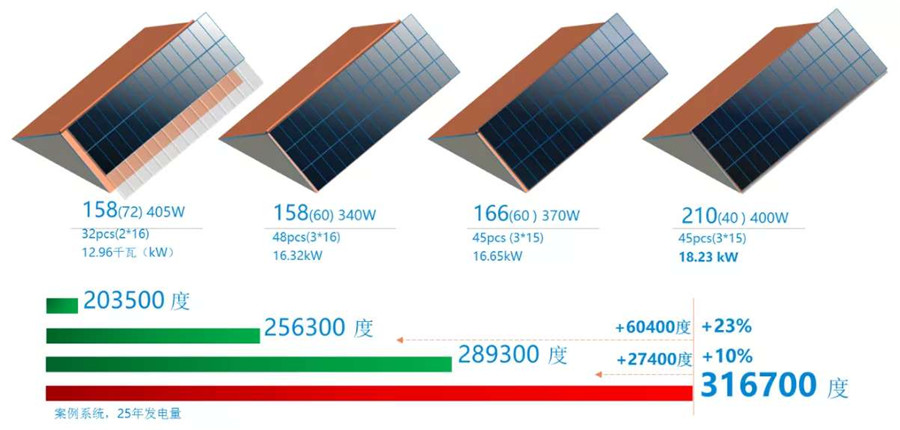 在這個案例下,使用210的400W小組件,裝機容量比158組件提高12%,比166組件提高10%,通過更大的裝機容量可以提高系統(tǒng)發(fā)電量,給用戶帶來每年更高的項目收益。