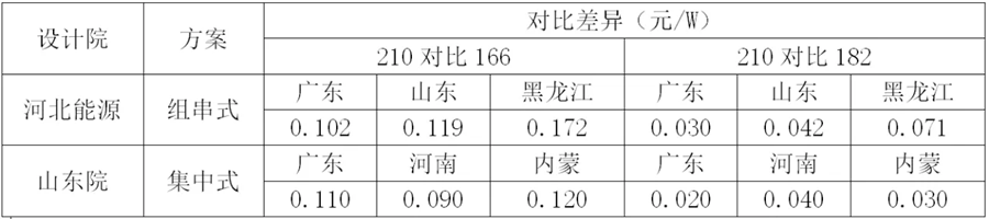 210產(chǎn)品的550W、600W以及660W,都是為大型地面電站設(shè)計的產(chǎn)品,目前進入量產(chǎn)的型號是550W。我們搜集了河北能源工程設(shè)計院和山東電力工程咨詢院兩家單位對于此款型號在不同緯度項目的系統(tǒng)造價差異對比結(jié)果,如下表: