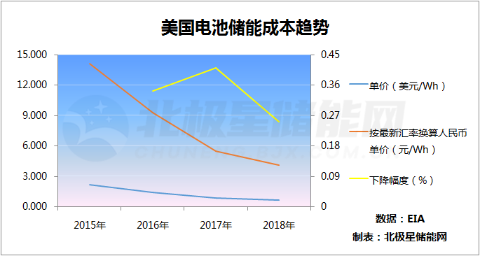 美國(guó)能源署的數(shù)據(jù)顯示,美國(guó)的電池儲(chǔ)能成本從2015年的2.153美元/Wh降到2018年0.625美元/Wh,三年儲(chǔ)能成本降幅超70%。2018年還曾有國(guó)外調(diào)研機(jī)構(gòu)預(yù)估,到2022年電池儲(chǔ)能系統(tǒng)價(jià)格將以每年8%的速度下降。