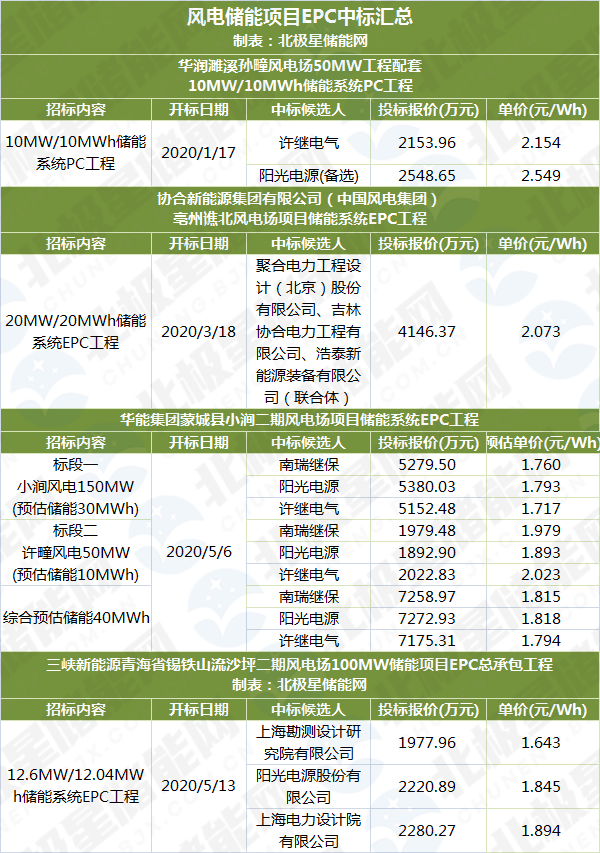 2020年初,多個(gè)風(fēng)電配套儲(chǔ)能項(xiàng)目陸續(xù)開標(biāo),據(jù)北極星儲(chǔ)能網(wǎng)統(tǒng)計(jì),同樣都是1C的電池儲(chǔ)能成本價(jià)格從1月份最高2.549元/Wh到5月已經(jīng)降到最低1.643元/Wh,一個(gè)季度儲(chǔ)能成本下降近三成。