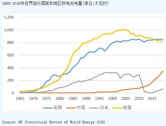 美國核電的不景氣在世界上不是個案。根據(jù)BP數(shù)據(jù),2019年世界核電發(fā)電量為2,796太瓦時,低于2006年2,803太瓦時的歷史峰值。具體到地區(qū),在美國核電萎靡不振的同時,歐洲和日本核電明顯衰落。