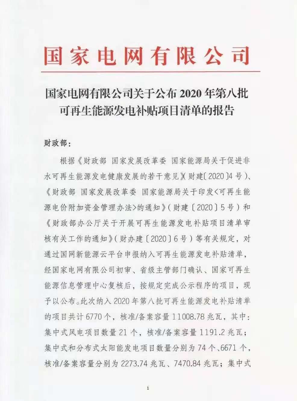 關(guān)于公布2020年第八批可再生能源發(fā)電補貼項目清單的公告