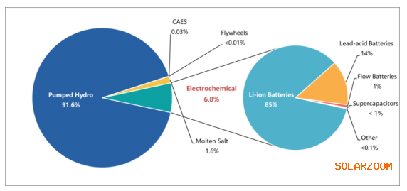 調(diào)查指出,目前中國(guó)累計(jì)部署的儲(chǔ)能項(xiàng)目總裝機(jī)容量約為33.1GW,目前全球累計(jì)裝機(jī)容量約為186.1GW。這些數(shù)字來(lái)自包括抽水蓄能設(shè)施在內(nèi)的各種儲(chǔ)能系統(tǒng),抽水蓄能設(shè)施的裝機(jī)容量仍占總裝機(jī)容量93%以上。