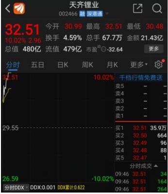 9日開盤,天齊鋰業(yè)大漲4.87%,報30.99元,11分鐘后封死漲停,報32.51元,封單近36萬手。