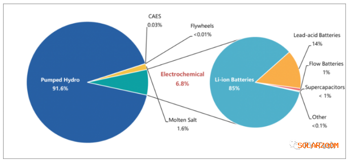 根據(jù)中國儲能聯(lián)盟(CNESA)內(nèi)部研究小組的統(tǒng)計,中國當(dāng)前的儲能項目裝機容量約為33.1GW,全球累計裝機容量約為186.1GW。包括抽水蓄能在內(nèi),這些數(shù)字包括了所有形式的儲能。目前,抽水蓄能在裝機容量中的占比仍超過90%。