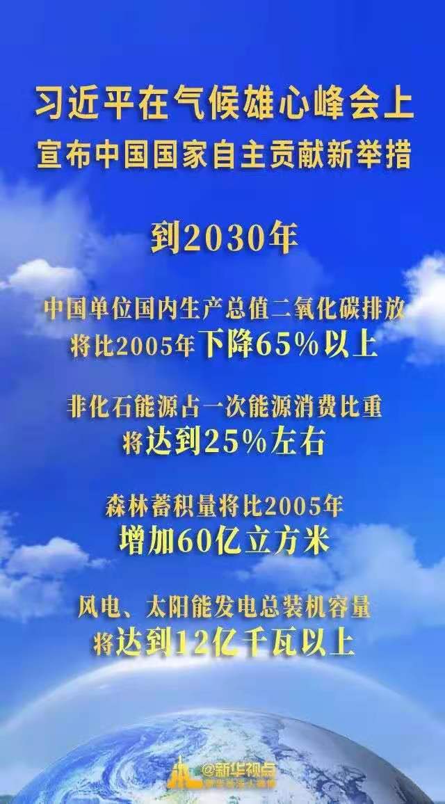 12月12日,在氣候雄心峰會(huì)上,國(guó)家主席習(xí)近平通過視頻發(fā)表題為《繼往開來,開啟全球應(yīng)對(duì)氣候變化新征程》的重要講話,宣布中國(guó)國(guó)家自主貢獻(xiàn)一系列新舉措。
