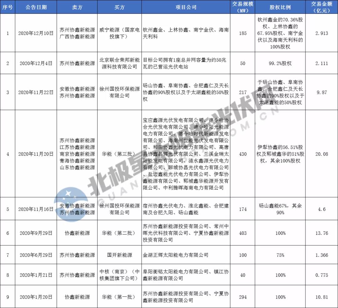 而這場(chǎng)“瘦身”行動(dòng)在今年更為快速,據(jù)北極星太陽(yáng)能光伏網(wǎng)統(tǒng)計(jì),2020年年初至今,協(xié)鑫新能源已進(jìn)行9次光伏電站出售交易,累計(jì)規(guī)模達(dá)到1893MW,交易總額達(dá)66.2848億元。