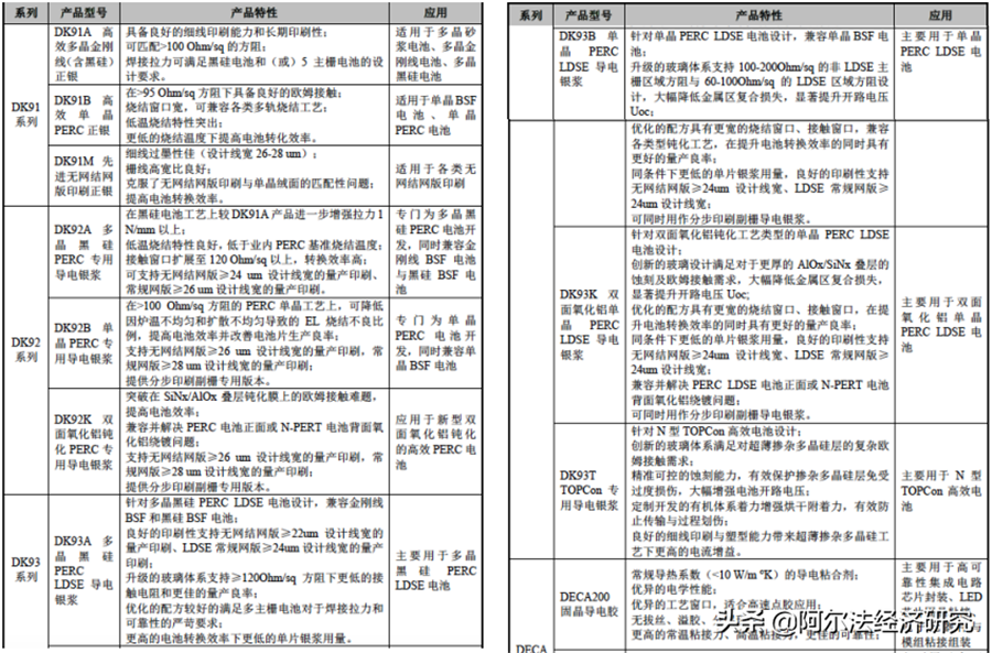 太陽能電池細(xì)分材料打破國外巨頭壟斷帝科股份的主要產(chǎn)品是晶硅太陽能電池正面銀漿,并積極研發(fā)和推廣太陽能疊瓦組件導(dǎo)電膠、半導(dǎo)體及顯示照明領(lǐng)域的封裝和裝聯(lián)材料等多類別產(chǎn)品,其中LED用固晶導(dǎo)電膠、半導(dǎo)體芯片粘接導(dǎo)電膠已于2019年開始推廣并形成銷售,不過銷售金額僅有23.86萬元,營收占比0.02%,占比太小。公司正面銀漿產(chǎn)品主要用于太陽能電池生產(chǎn),在常規(guī)單晶/多晶電池、金剛線黑硅電池、PERC單晶/多晶電池、N-PERT電池及高目數(shù)細(xì)線徑網(wǎng)版和無網(wǎng)結(jié)網(wǎng)版印刷等應(yīng)用上開發(fā)了多款產(chǎn)品,主要產(chǎn)品型號(hào)有DK91/DK92/DK93系列導(dǎo)電銀漿、DECA系列固晶導(dǎo)電膠和DK81A分布印刷專用主柵漿料: