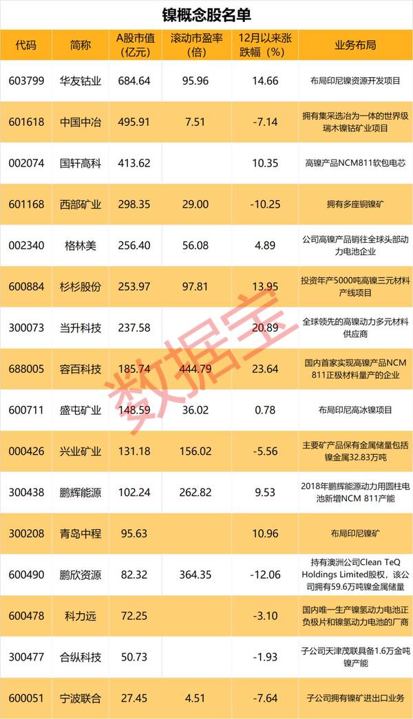 根據(jù)證券時(shí)報(bào).數(shù)據(jù)寶梳理,A股中涉及鎳的上市公司有16家,多家上市公司均在印尼鎳礦有業(yè)務(wù)布局。