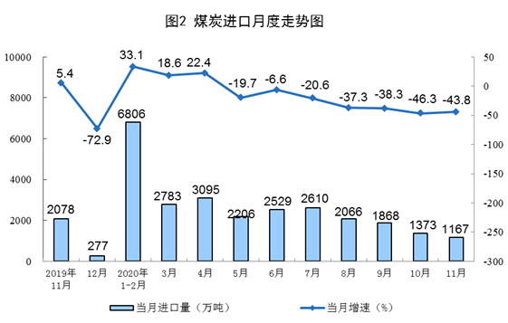 煤炭進口降幅有所收窄。11月份,進口煤炭1167萬噸,環(huán)比減少206萬噸,同比下降43.8%,降幅收窄2.5個百分點。1—11月份,進口煤炭2.6億噸,同比下降10.8%。