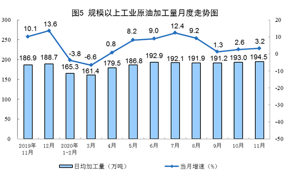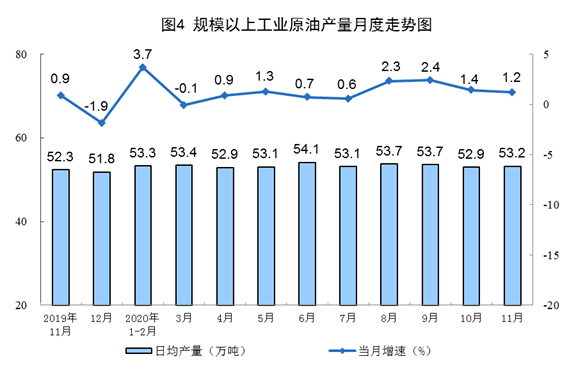 原油生產(chǎn)增速略有回落。11月份,生產(chǎn)原油1596萬噸,同比增長1.2%,增速比上月回落0.2個百分點;日產(chǎn)53.2萬噸,環(huán)比增加0.3萬噸。加工原油5835萬噸,增長3.2%,比上月加快0.6個百分點。1—11月份,生產(chǎn)原油1.8億噸,同比增長1.6%;加工原油6.1億噸,增長3.1%。