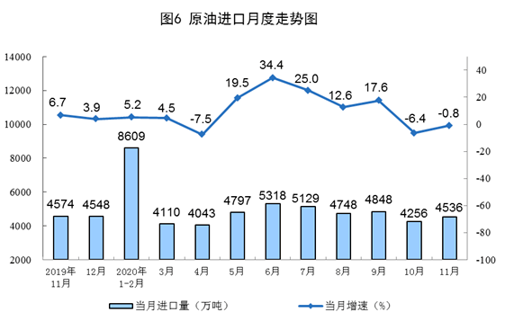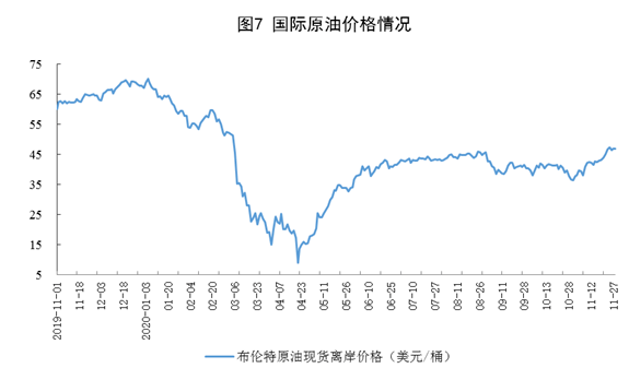 原油進口降幅收窄,國際原油價格上漲。進口原油4536萬噸,環(huán)比增加280萬噸,同比下降0.8%,降幅比上月收窄5.6個百分點;1—11月份,進口原油5.0億噸,同比增長9.5%。11月30日,布倫特原油現(xiàn)貨離岸價格為46.84美元/桶,比10月30日的36.33美元/桶上漲28.9%。