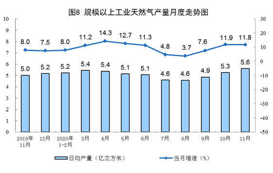 天然氣繼續(xù)保持較快增長。11月份,生產(chǎn)天然氣169億立方米,同比增長11.8%,增速比上月回落0.1個百分點;日產(chǎn)5.6億立方米,環(huán)比增加0.3億立方米。1—11月份,生產(chǎn)天然氣1702億立方米,同比增長9.3%。