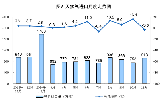 天然氣進口由增轉降。11月份,進口天然氣918萬噸,同比下降3.0%,上月為增長16.1%。1—11月份,進口天然氣9044萬噸,同比增長3.9%。