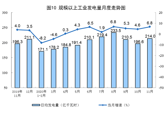 電力生產(chǎn)明顯加快。11月份,發(fā)電量6419億千瓦時,同比增長6.8%,增速比上月加快2.2個百分點;日均發(fā)電214.0億千瓦時,環(huán)比增加17.4億千瓦時。1—11月份,發(fā)電量66824億千瓦時,同比增長2.0%。
