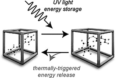 偶氮苯作為光開(kāi)關(guān)——一種分子機(jī)器,可對(duì)外部刺激(例如光或熱)作出響應(yīng)。在紫外線的作用下,分子在MOF孔框架中停留的同時(shí)改變形狀,有效地存儲(chǔ)了能量。向復(fù)合MOF材料施加熱量會(huì)觸發(fā)能量的快速釋放,該能量本身會(huì)散發(fā)出熱量,然后可潛在地用于加熱其他材料或設(shè)備。