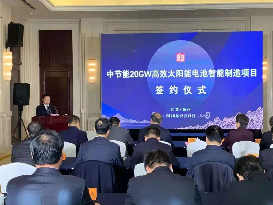 2020年12月17日,中節(jié)能太陽能高郵20GW高效電池制造基地(一期)項目投資協(xié)議簽約儀式在江蘇省揚州市舉行,標(biāo)志著中節(jié)能太陽能高郵20GW高效電池制造基地(一期)項目正式投資建設(shè)。揚州市委副書記、市長張寶娟、副市長方桂林,高郵市市委書記韋峰、市長張利,中節(jié)能太陽能股份有限公司(以下簡稱中節(jié)能太陽能)黨委書記、董事長曹華斌、副總經(jīng)理張蓉蓉、副總經(jīng)理姜利凱、總經(jīng)理助理黃中化及中節(jié)能太陽能科技(鎮(zhèn)江)有限公司黨總支書記、董事長李菁楠、總經(jīng)理黃國平出席活動。