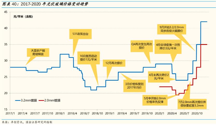 據(jù)PVInfolink統(tǒng)計(jì),國(guó)內(nèi)3.2mm光伏玻璃價(jià)格由2020年初的29元/平方米飆升至截至11月的42元/平方米,漲幅高達(dá)45%。2.0mm光伏玻璃的價(jià)格也是一路上揚(yáng),甚至早于3.2mm率先反彈。