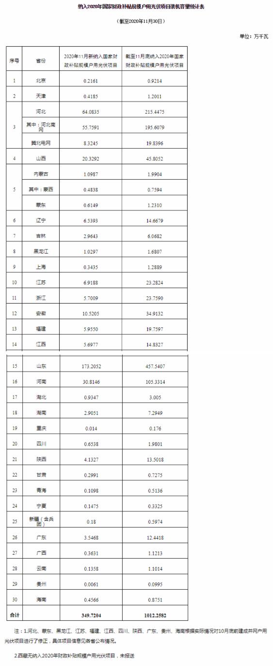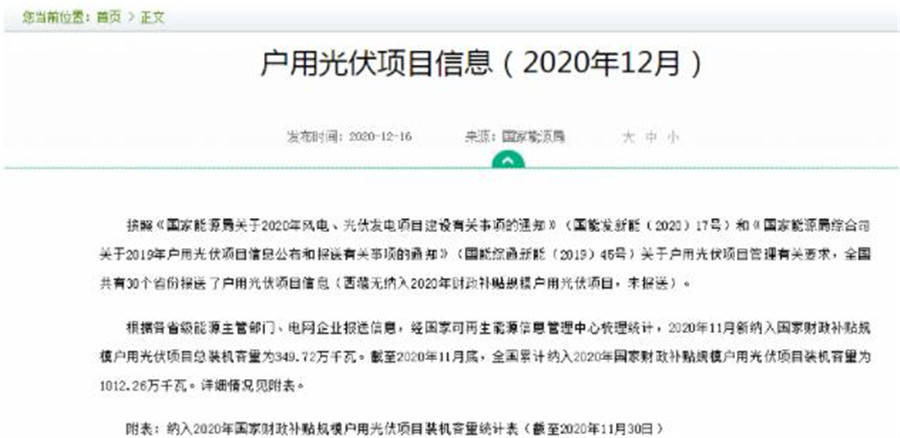 12月16日,國家能源局發(fā)布通知,宣布2020年前11月戶用光伏裝機數(shù)據(jù)。共有30個省份報送了戶用光伏項目信息(西藏?zé)o納入2020年財政補貼規(guī)模戶用光伏項目,未報送)。