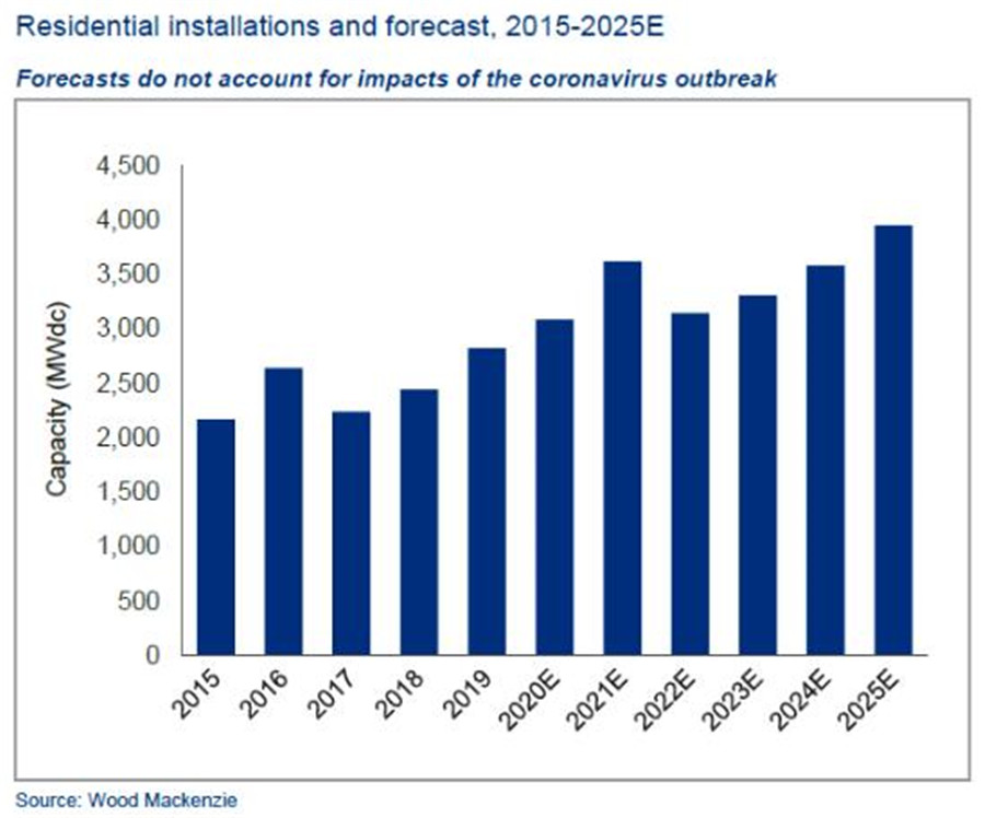 這是光伏產(chǎn)業(yè)成熟的必然結(jié)果,不僅我國如此,總裝機量高居全球第二的美國也同樣如此。據(jù)世界權(quán)威能源調(diào)研機構(gòu)Wood Mackenzie預(yù)測,在2020-2025年間,美國的戶用光伏將會保持高速增長,而非戶用光伏則要相對平穩(wěn)一些。