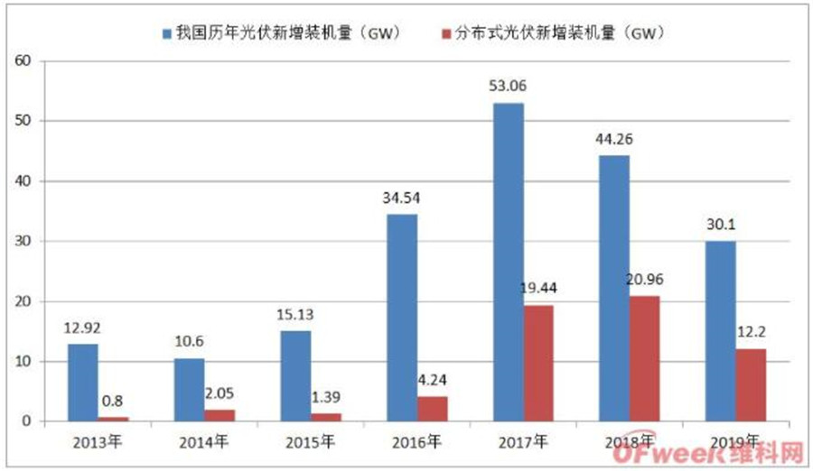 在2013年,我國光伏產(chǎn)品價格較高,還要依靠政策補貼進行推動,集中式光伏貢獻了大部分的裝機量。直到2017年有了突飛猛進的增長,從2016年的4.24GW提高到了19.44GW,首次突破了10GW。