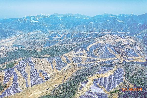 發(fā)電站背后十幾個山頭的向陽坡上,分散著占地700多畝的太陽能光伏發(fā)電場,在陽光下熠熠生輝。光伏板每塊約0.75平方米,總計有160萬塊,總裝機(jī)容量50兆瓦。在光照條件好的情況下,光伏板每天可發(fā)電近20萬千瓦時。