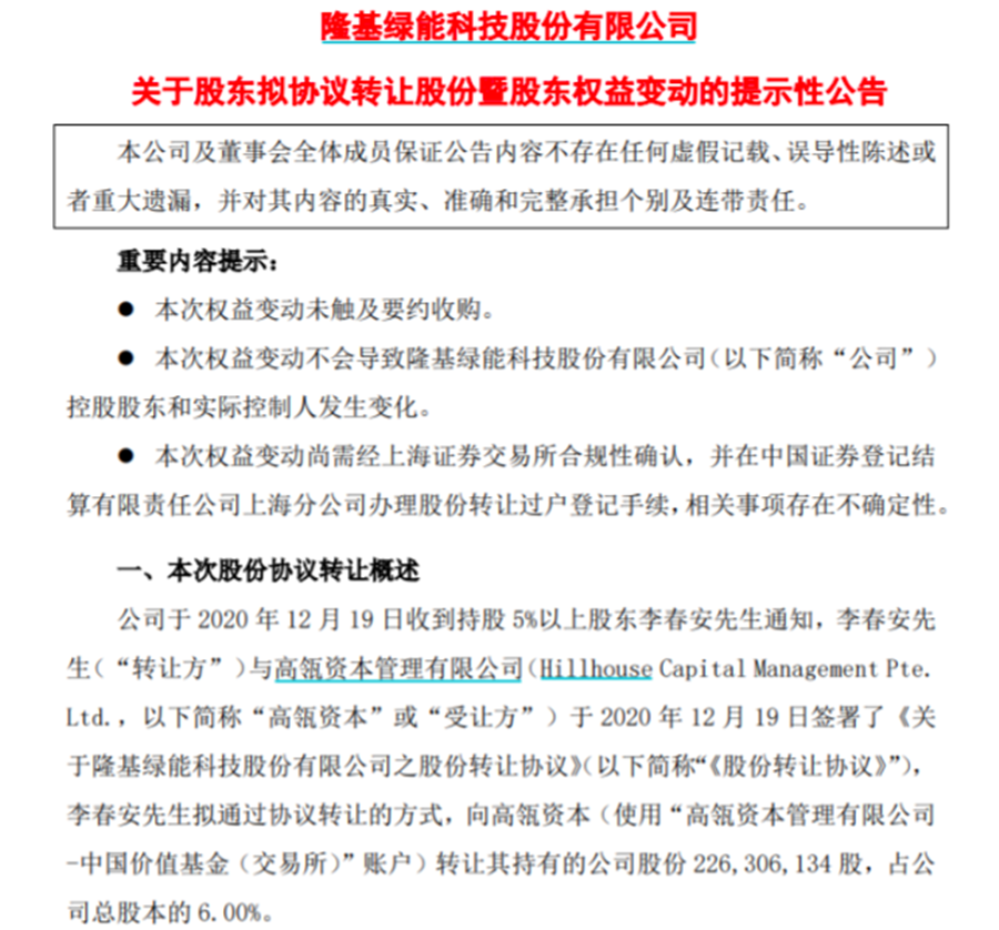 高瓴再出手,重金入股光伏巨頭12月20日,隆基股份發(fā)布公告稱,公司持股5%以上股東李春安與高瓴資本簽署股份轉(zhuǎn)讓協(xié)議,李春安擬向高瓴資本轉(zhuǎn)讓其持有的6%公司股份。公告顯示,交易雙方一致同意,本次交易的每股轉(zhuǎn)讓價(jià)格為70元,本次交易對(duì)價(jià)總額約為158.41億元。隆基股份最新收盤價(jià)為77.65元/股,本次交易的轉(zhuǎn)讓價(jià)格較其股價(jià)折價(jià)9.85%。交易完成后,高瓴資本將持有隆基股份6%的股權(quán),成為第二大股東。