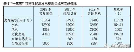 截至2019年,我國可再生能源發(fā)電裝機達到79400萬千瓦,實際完成率117.6%;其中水電裝機完成率104.7%、風電裝機完成率100%、光伏發(fā)電裝機完成率194%、生物質(zhì)發(fā)電裝機完成率150%、太陽能熱發(fā)電完成率84%。除了太陽能熱發(fā)電沒有完成規(guī)劃目標、風電剛好完成目標外,其余可再生能源發(fā)電裝機都超額完成了規(guī)劃任務(wù)。