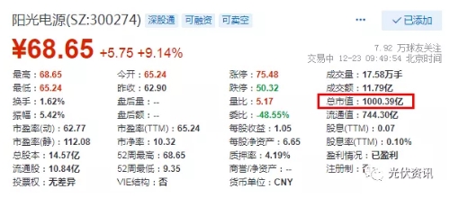 微信公眾號(PV-info)了解到,剛剛!光伏逆變器企業(yè)-陽光電源市值正式突破1000億元!成為逆變器企業(yè)中第一家破千億、光伏企業(yè)中第三家破千億的企業(yè)!