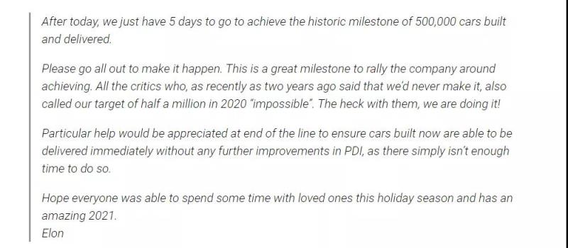 在距今年結(jié)束僅剩5天的時間,馬斯克再次致信員工,認(rèn)為仍有可能實現(xiàn)目標(biāo),鼓勵員工團(tuán)結(jié)起來,證明懷疑者是錯的。馬斯克在信中表示:“請全力以赴地去實現(xiàn)目標(biāo)。這是一個公司可以團(tuán)結(jié)起來實現(xiàn)的偉大里程碑。兩年前還有人說我們永遠(yuǎn)實現(xiàn)不了,稱50萬的目標(biāo)不可能,不要管他們,我們就要實現(xiàn)了!”